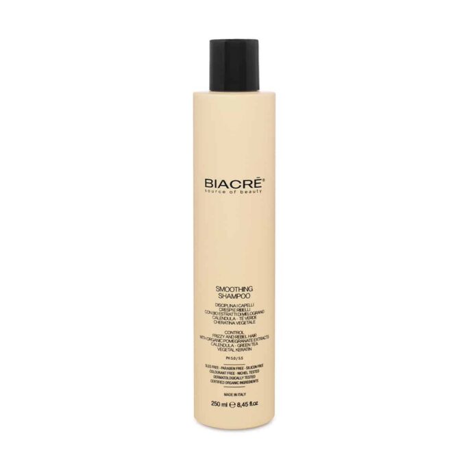 BIACRÈ siluv šampoon vähendab kahusust ja aitab kontrolli alla saada jonnakad juuksekarvad, muutes juuksed siledamaks, siidisemaks ja kergesti kammitavaks. Orgaaniline granaatõunaekstrakt parandab juuste kahjustusi ja katkiseid otsi, saialilleekstrakt pehmendab ja silub, rohelise tee ekstrakt taastab tugevuse ja elastsuse. 93% koostisosadest on looduslikku päritolu ning šampoon ei sisalda sulfaate, silikoone ega parabeene.